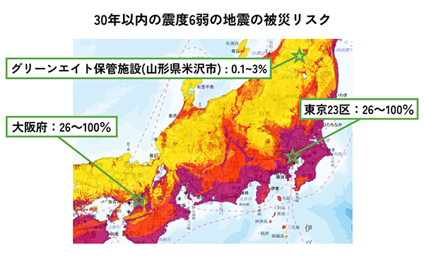 大都市圏では首都直下地震や南海トラフ地震等、地震リスクが大変高く、直近30年以内に東日本大震災レベルの地震が来ることはほぼ確実*2になっています。グリーンエイトの保管施設は地震リスクが低く、5年、10年といった長期間も安心して保管していただけます。東北の中でも太平洋側とは地盤が異なり、東日本大震災でも人的被害が出なかった土地です。